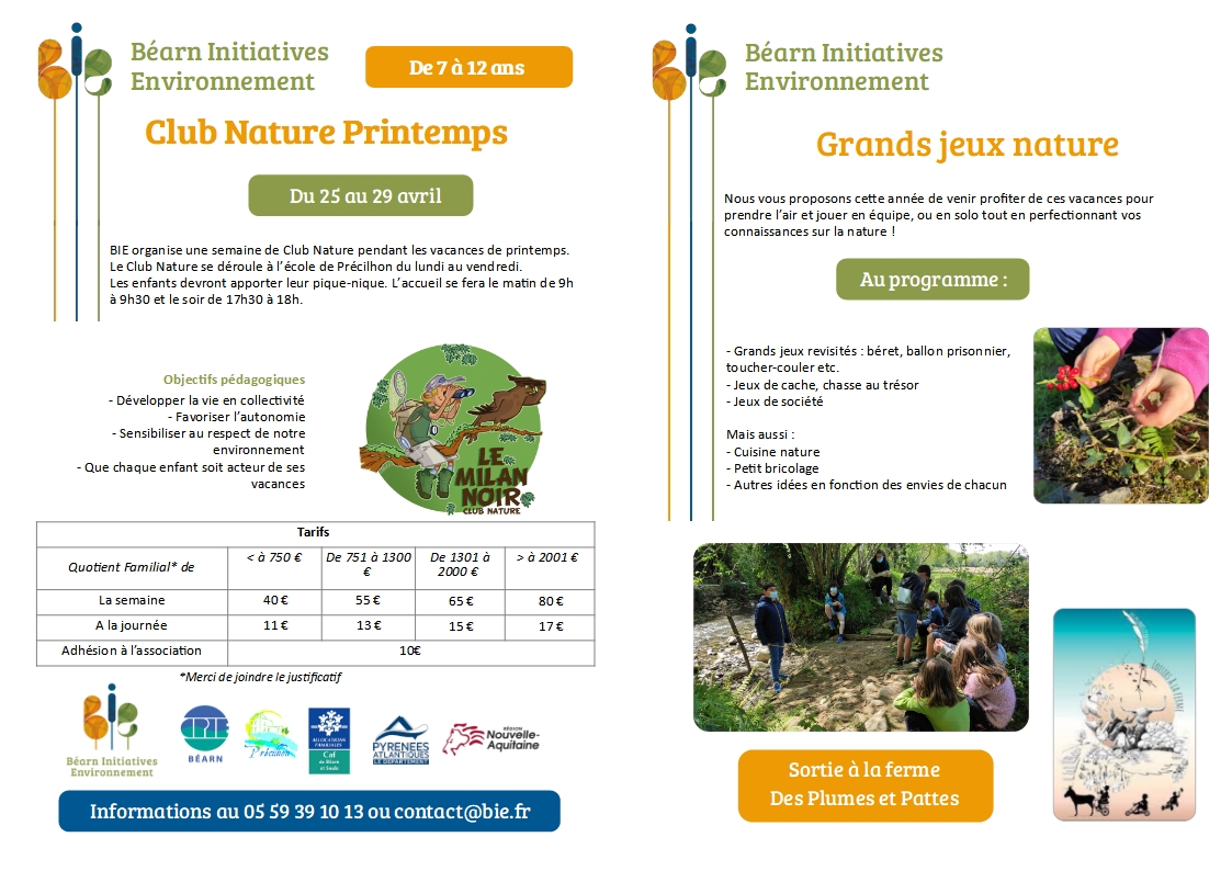 Le Club Nature Printemps ouvre ses portes du 25 au 29 avril à l'école de Précilhon, pour les enfants de 7 à 12 ans. Viens découvrir la nature, reconnaitre les arbres, les insectes, les oiseaux... ou jouer à de grands jeux comme le béret, à des jeux de société, chercher des trésors ou créer une [...]