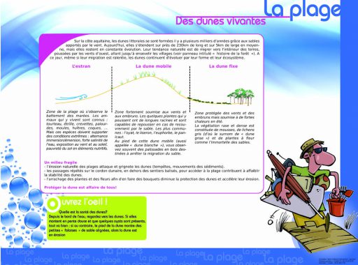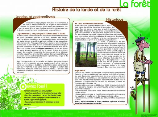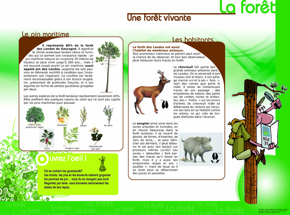 Les 10 panneaux installés le long du sentier présentent différentes thématiques comme les milieux forestier, lacustre et maritime landais. Vous pouvez les découvrir ci-dessous :