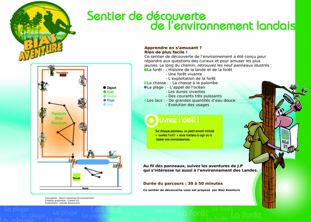 Le site de Bias aventure dans les Landes propose aux publics de pratiquer l’accrobranche et de multiples activités. Le sentier permet de découvrir le patrimoine naturel local et les activités humaines associées, en particulier pour les accompagnateurs ne pratiquant pas l’accrobranche.